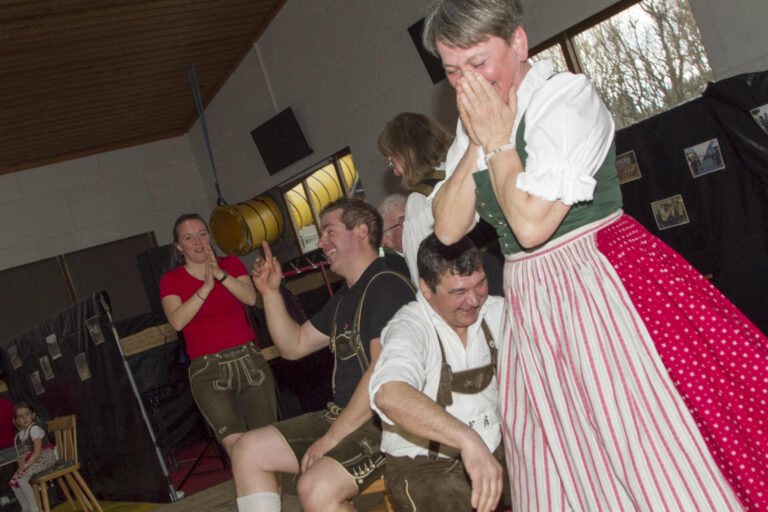 Der traditionelle Sesseltanz entschied über die Gewinnfarbe der Tombola. Fünf Paare tanzten zunächst um vier Sessel – mit jeder Runde schieden Teilnehmer aus, bis schließlich nur noch ein Paar übrig blieb. Christina und Lukas sicherten sich den letzten Platz und damit den Sieg: Die Gewinnfarbe lautete Rot.